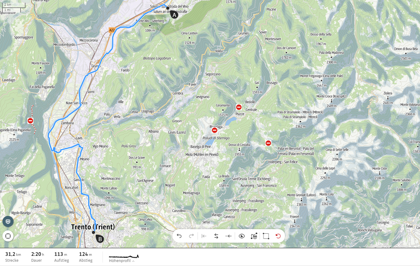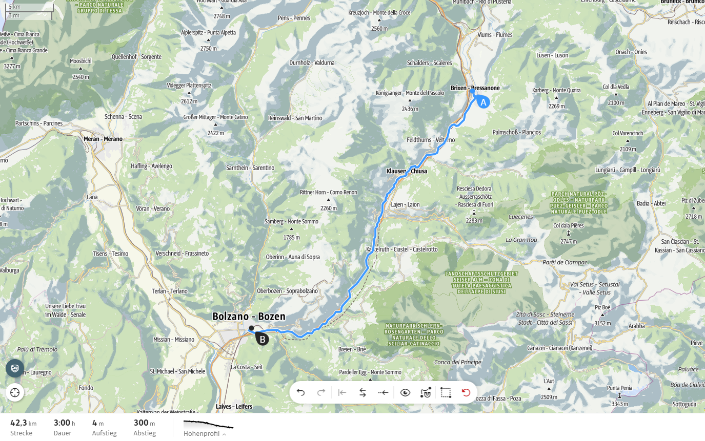 Fahrt mit dem Südtirol Express von Sigmundskron nach Brixen. Von Brixen aus immer bergab, vorbei an Klausen bis nach Bozen zurück.