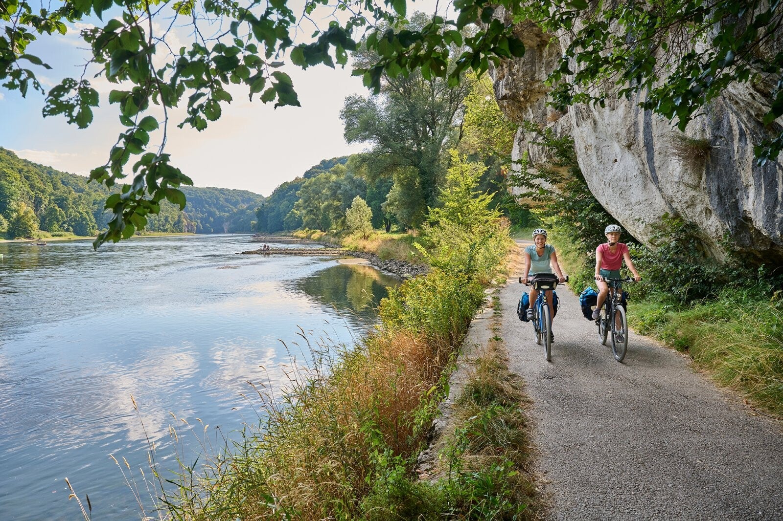 Unser Tipp: Kürzt die Etappe mit einer Zillenfahrt ab. So spart ihr euch nicht nur ein paar Höhenmeter, sondern erlebt die Weltenburger Enge mit dem Donaudurchbruch aus einer ganz besonderen Perspektive. Die Fahrt mit den traditionellen Fischerboote der Donau endet an der Wipfelsfurt. Von dort radelt ihr entlang der Donau bis nach Kelheim. Neben euch ragen die bis zu 80 Meter hoch aufragenden Jurabrocken empor - darunter der Räuberfelsen, Bayerischer Löwe oder Napoelons Reisekoffer, den er der Sage nach bei seinem Rückzug vergessen haben soll.